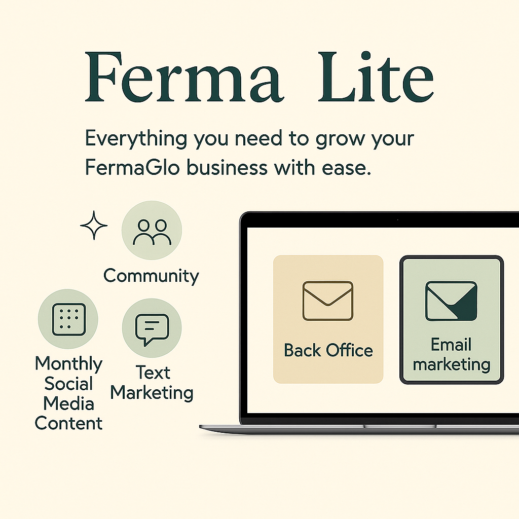 This digital product gives you everything you need to grow your FermaGlo business with ease. You’ll get access to your personalized Back Office, our Community Hub with exclusive courses and social media calendars, and done-for-you marketing—texts and emails sent to your clients and team so you can stay focused on building your business.